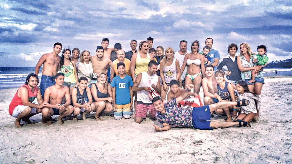 Laura Arraya, Luis Avellaneda y su hija, Luisina Avellaneda; Bibi San Martín, Carolina Sleiman, Exequiel Idiart, Fernanda Arraya, Cacho Avellaneda, Mónica Idiart y Azul Avellaneda, Benjamín Avellaneda, Alejandra y Pablo Idiart; Sofía y Nacho Idiart. Al fondo, los imponentes edificios de Camboriú.