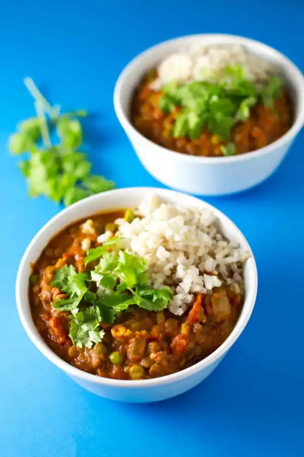 Ingredientes: 400 ml de leche de coco, 300 g de lentejas cocidas, 100 ml de crema de leche, 80 g de espinacas o acelga fresca, 4 tomates, 3 cucharadas de curry, 2 cebollas y aceite de girasol.
