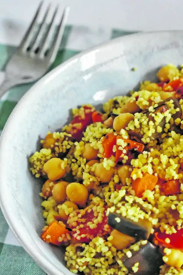 Ingredientes: 100 g de cous cous, 90 ml de vino tinto dulce, 80 g de garbanzos en lata, 50 g de berenjena, 50 g de zucchini, 30 g de pasas de uva deshidratadas, 15 ml de agua tibia, 10 ml de aceite de oliva extra virgen, 1 zanahoria, 1 diente de ajo, media cebolla blanca o morada, una cucharada de ají picante y una pizca de sal.