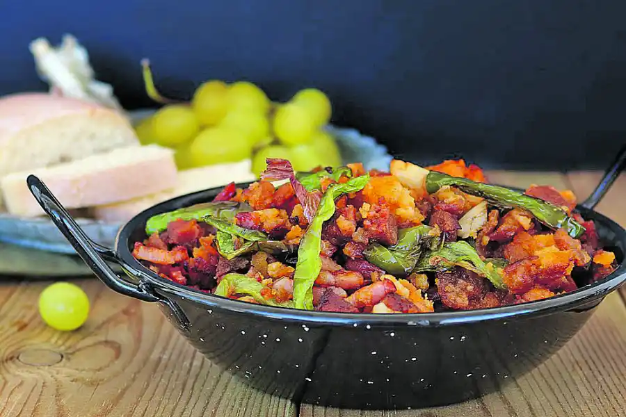 Ingredientes: 750 g de pan francés o mignon (de preferencia de hace uno o dos días), 500 ml de agua tibia, 150 g de aceite de oliva, 15 g de chorizo colorado, 2 lonjas de panceta, 1 pimiento verde, 1 pimiento rojo y 1 cebolla.