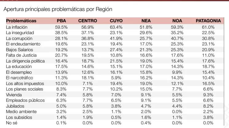 El diagnóstico, al que accedió LA GACETA, revela que los habitantes de las provincias de Cuyo son los que más se inclinaron a contestar que esa inflación es el principal problema (un 63,4% respondió en ese sentido), seguido por los ciudadanos de la Patagonia, con un 61%. La inseguridad golpea más en la zona centro del país y en Buenos Aires con un 38%, mientras que en el NOA inquieta más al 35% de la población sondeada. En cuanto a la corrupción, Cuyo también es la región con más inquietud ciudadana (41,9%), seguido por el NOA (40,7%).