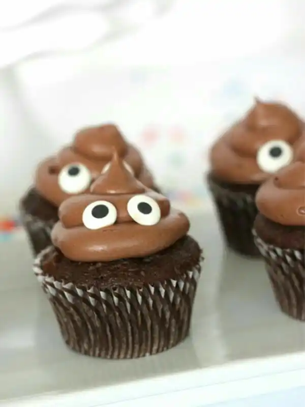 10. Verter la crema de chocoporotos en una manga repostera y decorar los muffins para simular la tradicional imagen de poomoji. En caso de no tener manga se puede hacer a mano con ayuda de una espátula o cuchillo pequeño.