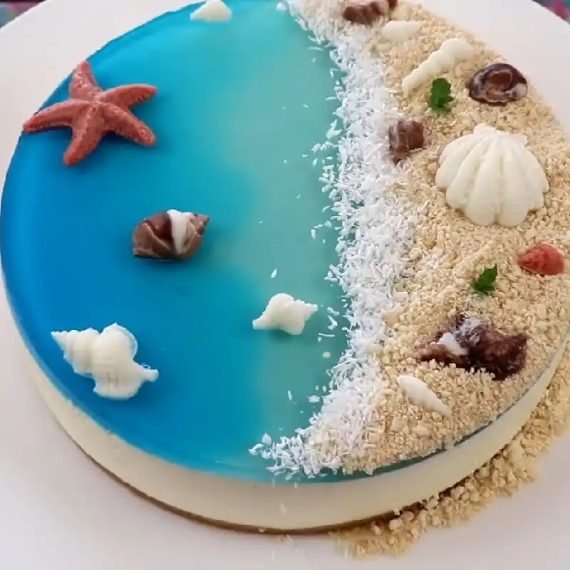 10. Decorar con galletas trituradas, coco rallado y otros accesorios para simular la arena y las olas de una playa.