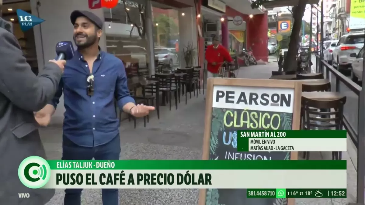 En San Martín al 200, de la ciudad de San Miguel de Tucumán, un bar puso el café a precio dólar: el clásico más dos tortillas o dos medialunas está U$S 0,99. Así figura en la pizarra ubicada en la vereda del local.