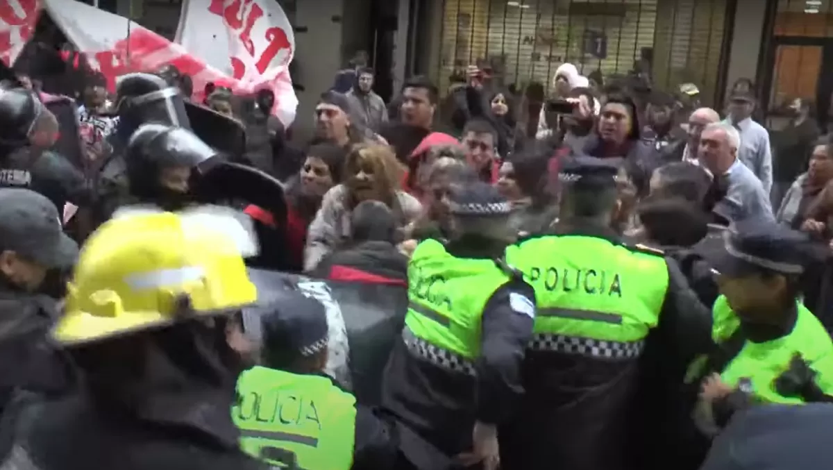 Integrantes de la Multisectorial de Organización Barrial y efectivos de Infantería de la Policía protagonizaron un enfrentamiento durante una protesta frente al Ministerio de Desarrollo Social provincial, en la capital.