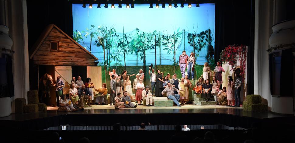 PAISAJE PUEBLERINO. El coro de campesinos canta mientras se encuentran Nemorino y Adina; a la izquierda, en el establo, el realista caballo-títere. LA GACETA / FOTO DE JOSÉ NUNO.