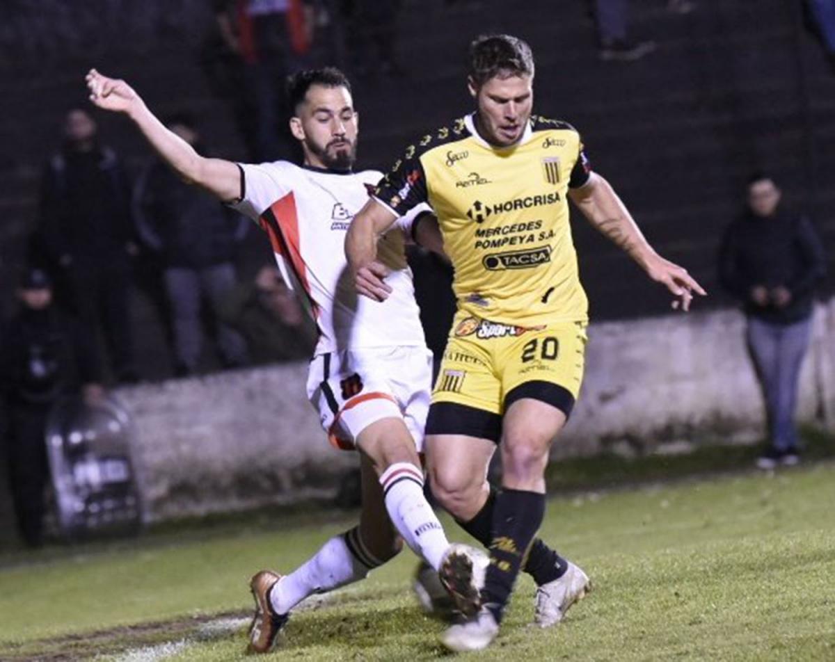 FRICCIONADO. Rivero lucha con Del Grecco; el partido fue casi una batalla.