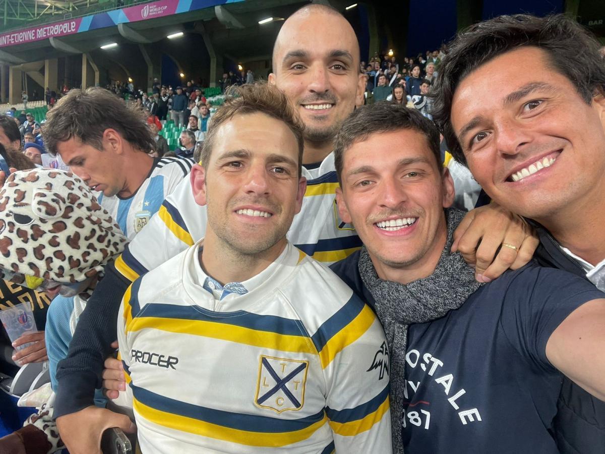 Nico Sánchez con la camiseta de Lawn Tennis que le llevó Santiago Juárez Chico, medio scrum del club. Junto a ellos, Manuel Cáceres y Agustín Guzmán.