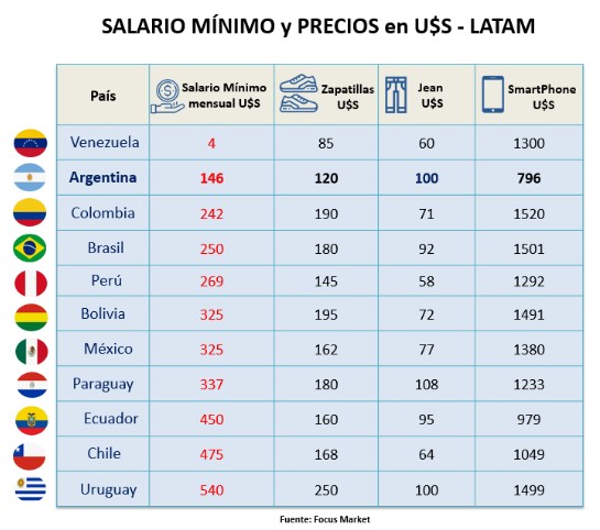 Una manera de medir la profundidad de la crisis económica en la Argentina es compararla con la situación de los países vecinos. En esa orientación, Focus Market tomó como base de referencia el sueldo mínimo de los países de la región (en la Argentina equivale a U$S 146 mensuales) y, a partir de esa cifra ponderó cuántas horas le puede llevar a un habitante de cada país comprar con aquel salario, por ejemplo, un Jean, un par de zapatillas o un Smartphone.