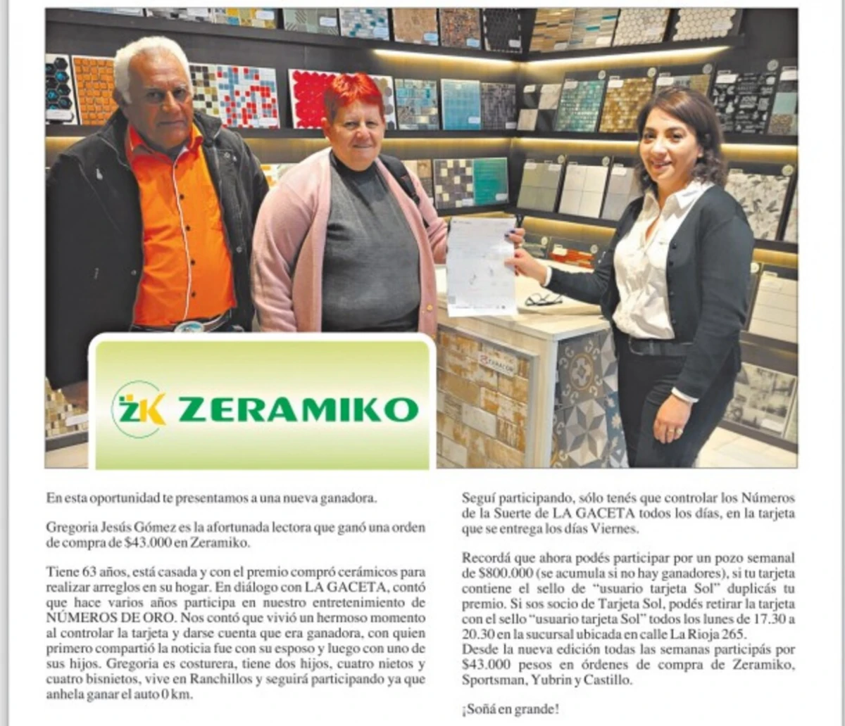 Números de la Suerte: Gregoria Jesús Gómez ganó una orden de compra de $43.000 en Zeramiko