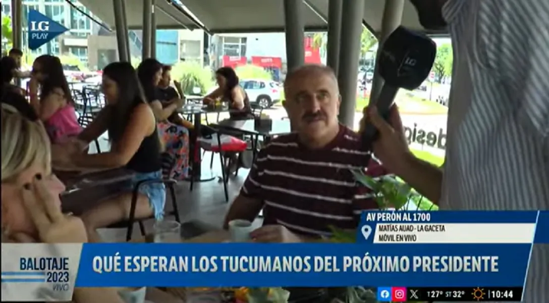 El candidato libertario fue el más elegido en Tucumán y eso se notó en el móvil, tanto que hasta hubo tiempo para bromas, como la de este señor que se hizo el desentendido, acompañado por una mujer que aseguró estar muy feliz a la espera de lo que pueda hacer el presidente libertario en el país.
