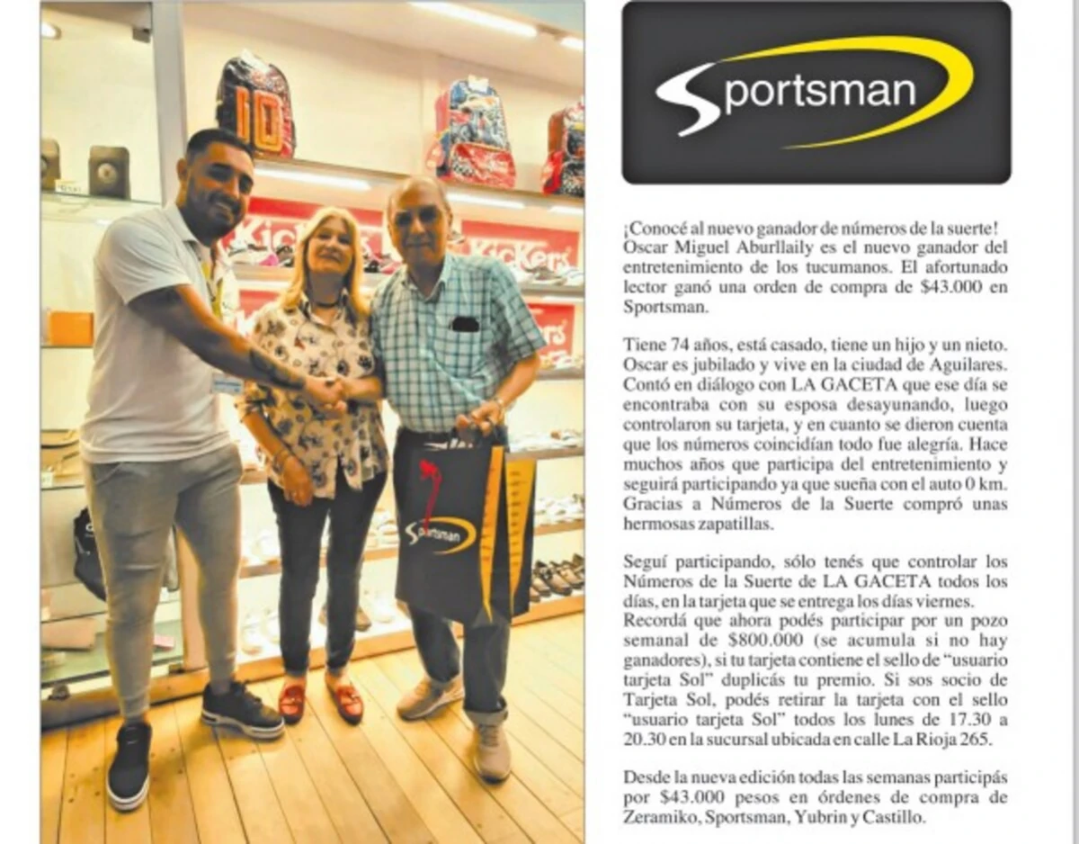 Números de la Suerte: Oscar Miguel Aburllaily ganó una orden de compra de $43.000 en Sportsman