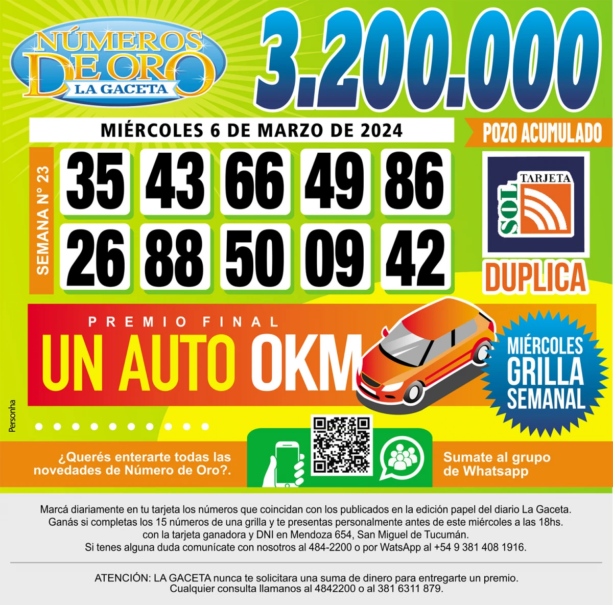Números de Oro Los Números de Oro de LA GACETA del 6 de marzo de 2024 Compartir Whatsapp Facebook X Copiar dirección URL 06 Marzo 2024 Seguir en Esta nota es de acceso libre. Tamaño texto Comentarios Lo más popular Carta a los jueces ante quienes litigo Liberaron a Máximo Carreras, el otro acusado de atacar a Patricio Ledezma en Tafí del Valle El avance narco en Tucumán está acompañado por otros delitos La UNT espera el aval judicial para avanzar con la Ciudad Universitaria Tucumán, en alerta amarilla: se esperan lluvias en el inicio de la semana Causa Andis: procesaron a Diego Spagnuolo y a otros 18 implicados por el cobro de coimas