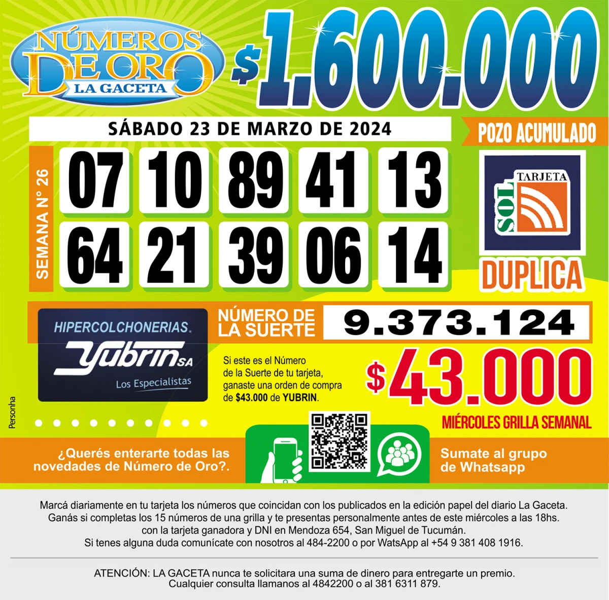 Números de Oro Los Números de Oro de LA GACETA del 23 de marzo de 2024 Compartir Whatsapp Facebook X Copiar dirección URL 23 Marzo 2024 Seguir en Esta nota es de acceso libre. Temas El SalvadorWhatsApp Tamaño texto Comentarios Lo más popular UTA Tucumán confirma un paro de colectivos contra la reforma laboral en la previa a la cita en Diputados Proponen transformar El Bajo en una especie de mini Puerto Madero Importaciones de cubiertas chinas: Fate anunció su cierre definitivo y el despido de 920 trabajadores Ataque en Tafí del Valle: una espera que despierta sospechas Cierra Fate y más de 900 trabajadores quedan afectados: “De esenciales pasamos a ser descartables” Aguiar, referente de ATE: “Por mecanismos constitucionales, este Gobierno debería terminar hoy”