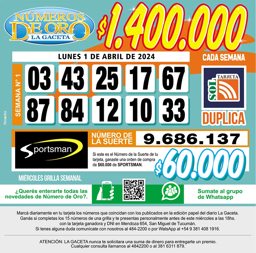 Los Números de Oro de LA GACETA del 1 de abril de 2024