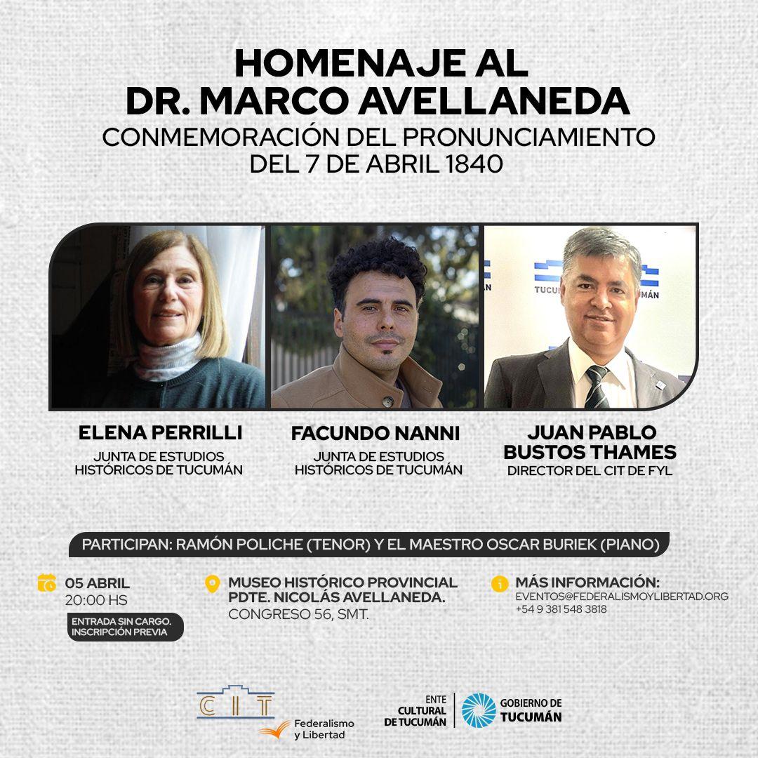 Con motivo de conmemorarse un nuevo aniversario del 7 de Abril de 1840, gesta en la que Marco Avellaneda encabezó el célebre Pronunciamiento de Tucumán a favor de la Libertad y de la Organización Nacional, el Centro de Investigaciones Tucumán (CIT) -de la Fundación Federalismo y Libertad- organiza un acto en homenaje a ese importante hito de nuestra historia, que tendrá lugar el viernes, a las 20, en el Museo Histórico Provincial Presidente Nicolás Avellaneda (Congreso 56).
