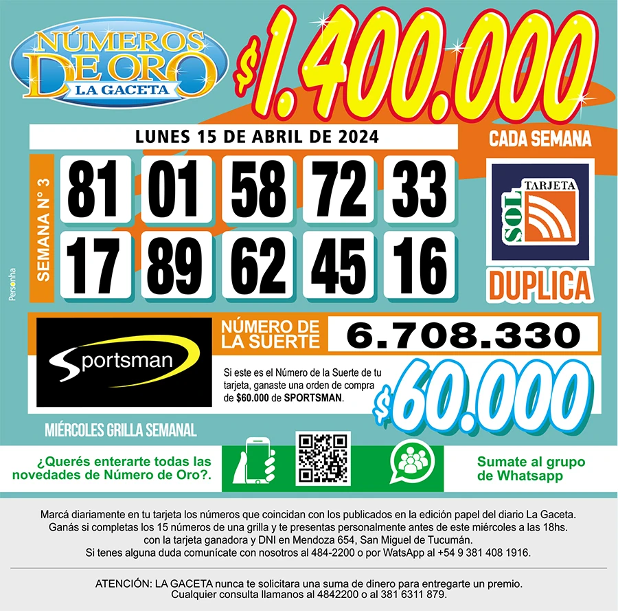 Números de Oro Los Números de Oro de LA GACETA del 15 de abril de 2024 Compartir Whatsapp Facebook X Copiar dirección URL 15 Abril 2024 Seguir en Esta nota es de acceso libre. Temas GmailWhatsAppOriente MedioArgentina Tamaño texto Comentarios Lo más popular UTA Tucumán confirma un paro de colectivos contra la reforma laboral en la previa a la cita en Diputados Proponen transformar El Bajo en una especie de mini Puerto Madero Importaciones de cubiertas chinas: Fate anunció su cierre definitivo y el despido de 920 trabajadores Ataque en Tafí del Valle: una espera que despierta sospechas Aguiar, referente de ATE: “Por mecanismos constitucionales, este Gobierno debería terminar hoy” Cierra Fate y más de 900 trabajadores quedan afectados: “De esenciales pasamos a ser descartables”
