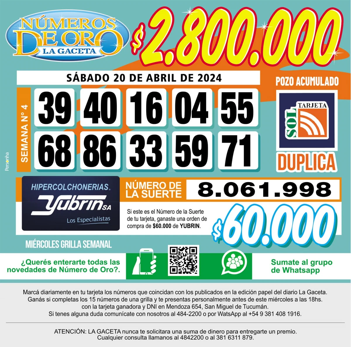 Números de Oro Los Números de Oro de LA GACETA del 20 de abril de 2024 Compartir Whatsapp Facebook X Copiar dirección URL 20 Abril 2024 Seguir en Esta nota es de acceso libre. Temas WhatsApp Tamaño texto Comentarios Lo más popular UTA Tucumán confirma un paro de colectivos contra la reforma laboral en la previa a la cita en Diputados Proponen transformar El Bajo en una especie de mini Puerto Madero Importaciones de cubiertas chinas: Fate anunció su cierre definitivo y el despido de 920 trabajadores Ataque en Tafí del Valle: una espera que despierta sospechas Aguiar, referente de ATE: “Por mecanismos constitucionales, este Gobierno debería terminar hoy” Cierra Fate y más de 900 trabajadores quedan afectados: “De esenciales pasamos a ser descartables”