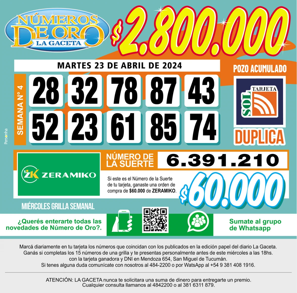 Números de Oro Los Números de Oro de LA GACETA del 23 de abril de 2024 Compartir Whatsapp Facebook X Copiar dirección URL 23 Abril 2024 Seguir en Esta nota es de acceso libre. Temas WhatsAppPúblico Tamaño texto Comentarios Lo más popular UTA Tucumán confirma un paro de colectivos contra la reforma laboral en la previa a la cita en Diputados Proponen transformar El Bajo en una especie de mini Puerto Madero Importaciones de cubiertas chinas: Fate anunció su cierre definitivo y el despido de 920 trabajadores Ataque en Tafí del Valle: una espera que despierta sospechas Aguiar, referente de ATE: “Por mecanismos constitucionales, este Gobierno debería terminar hoy” Cierra Fate y más de 900 trabajadores quedan afectados: “De esenciales pasamos a ser descartables”