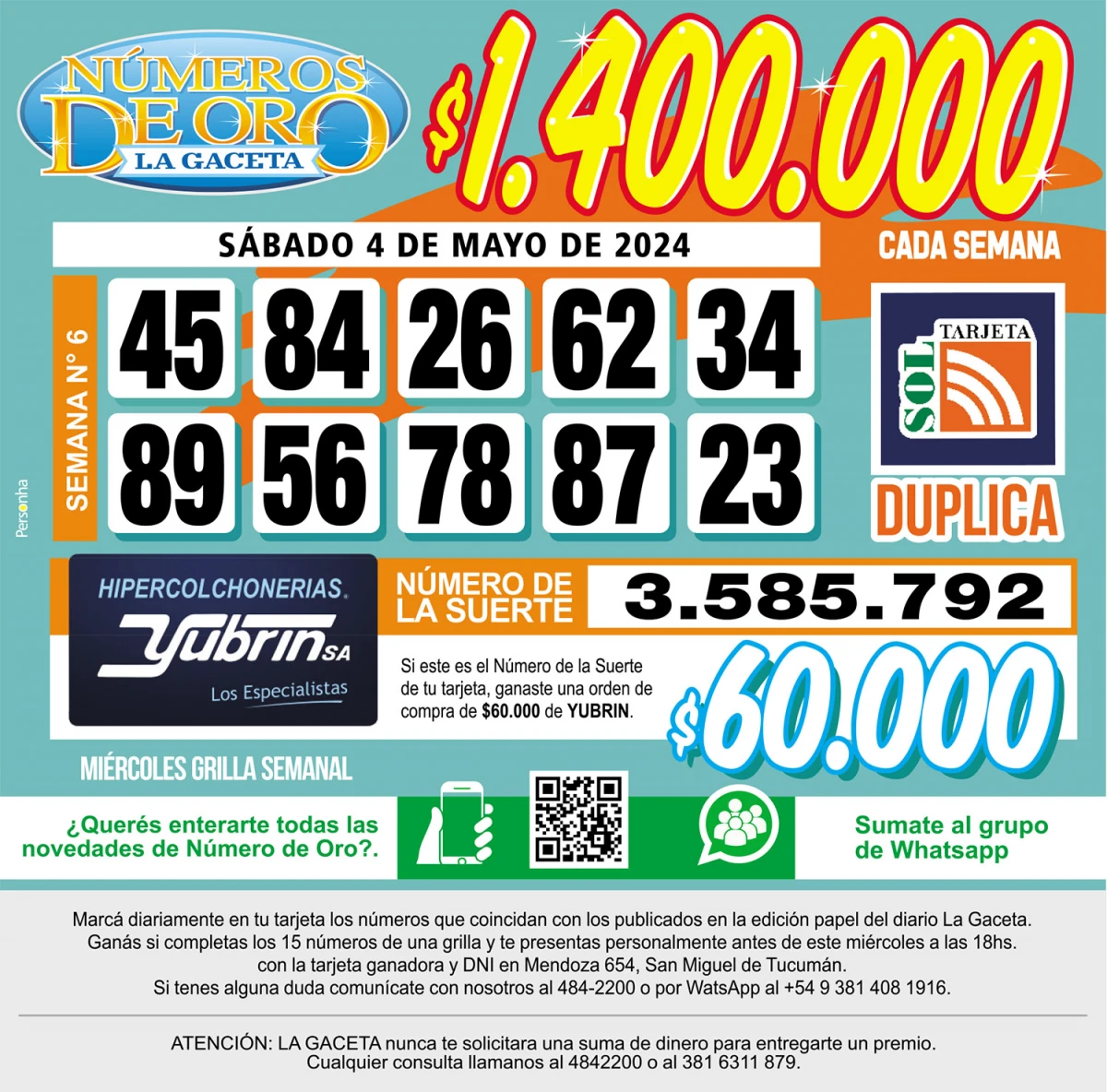 Números de Oro Los Números de Oro de LA GACETA del 4 de mayo de 2024 Compartir Whatsapp Facebook X Copiar dirección URL 04 Mayo 2024 Seguir en Esta nota es de acceso libre. Temas WhatsApp Tamaño texto Comentarios Lo más popular UTA Tucumán confirma un paro de colectivos contra la reforma laboral en la previa a la cita en Diputados Proponen transformar El Bajo en una especie de mini Puerto Madero Importaciones de cubiertas chinas: Fate anunció su cierre definitivo y el despido de 920 trabajadores Ataque en Tafí del Valle: una espera que despierta sospechas La lista de nombres que Santiago Bagne aportó para profundizar la pesquisa Ataque en Tafí del Valle: la violencia arruinó el plan de vacaciones