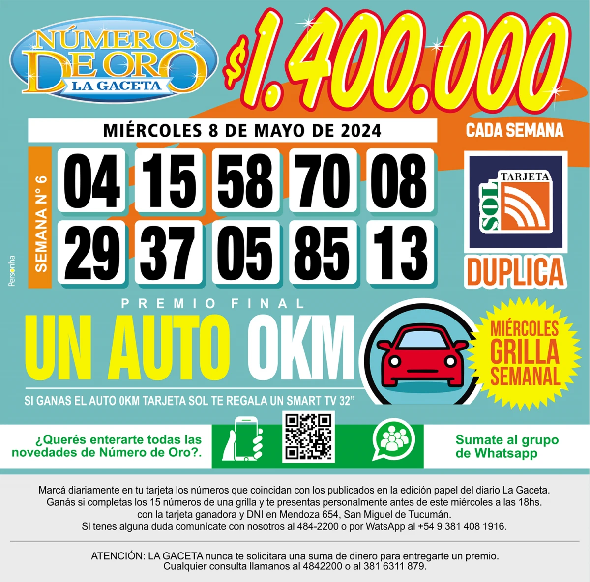 Números de Oro Los Números de Oro de LA GACETA del 8 de mayo de 2024 Compartir Whatsapp Facebook X Copiar dirección URL 08 Mayo 2024 Seguir en Esta nota es de acceso libre. Temas WhatsApp Tamaño texto Comentarios Lo más popular UTA Tucumán confirma un paro de colectivos contra la reforma laboral en la previa a la cita en Diputados Proponen transformar El Bajo en una especie de mini Puerto Madero Importaciones de cubiertas chinas: Fate anunció su cierre definitivo y el despido de 920 trabajadores Ataque en Tafí del Valle: una espera que despierta sospechas La lista de nombres que Santiago Bagne aportó para profundizar la pesquisa Ataque en Tafí del Valle: la violencia arruinó el plan de vacaciones