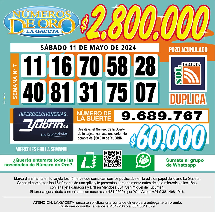 Números de Oro Los Números de Oro de LA GACETA del 11 de mayo de 2024 Compartir Whatsapp Facebook X Copiar dirección URL 11 Mayo 2024 Seguir en Esta nota es de acceso libre. Temas WhatsAppArgentina Tamaño texto Comentarios Lo más popular UTA Tucumán confirma un paro de colectivos contra la reforma laboral en la previa a la cita en Diputados Proponen transformar El Bajo en una especie de mini Puerto Madero Importaciones de cubiertas chinas: Fate anunció su cierre definitivo y el despido de 920 trabajadores Ataque en Tafí del Valle: una espera que despierta sospechas La lista de nombres que Santiago Bagne aportó para profundizar la pesquisa Ataque en Tafí del Valle: la violencia arruinó el plan de vacaciones