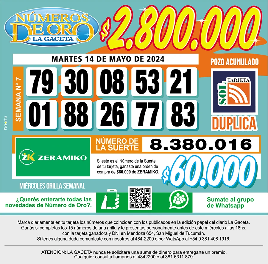 Esta es la grilla completa de los Números de Oro de LA GACETA del 15 de mayo de 2024