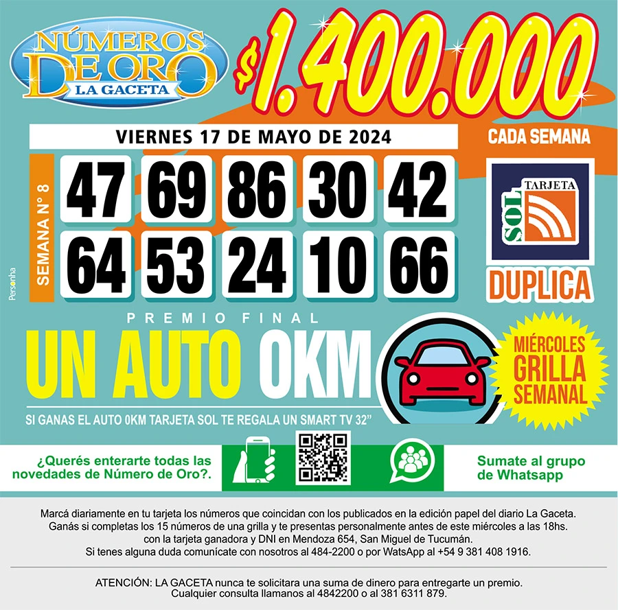 Números de Oro Los Números de Oro de LA GACETA del 17 de mayo de 2024 Compartir Whatsapp Facebook X Copiar dirección URL 17 Mayo 2024 Seguir en Esta nota es de acceso libre. Tamaño texto Comentarios Lo más popular UTA Tucumán confirma un paro de colectivos contra la reforma laboral en la previa a la cita en Diputados Proponen transformar El Bajo en una especie de mini Puerto Madero Importaciones de cubiertas chinas: Fate anunció su cierre definitivo y el despido de 920 trabajadores Ataque en Tafí del Valle: una espera que despierta sospechas La lista de nombres que Santiago Bagne aportó para profundizar la pesquisa Ataque en Tafí del Valle: la violencia arruinó el plan de vacaciones