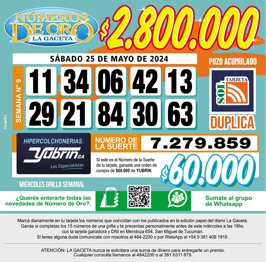 Números de Oro Los Números de Oro de LA GACETA del 25 de mayo de 2024 Compartir Whatsapp Facebook X Copiar dirección URL 25 Mayo 2024 Seguir en Esta nota es de acceso libre. Temas WhatsAppArgentina Tamaño texto Comentarios Lo más popular UTA Tucumán confirma un paro de colectivos contra la reforma laboral en la previa a la cita en Diputados Proponen transformar El Bajo en una especie de mini Puerto Madero Importaciones de cubiertas chinas: Fate anunció su cierre definitivo y el despido de 920 trabajadores Ataque en Tafí del Valle: una espera que despierta sospechas La lista de nombres que Santiago Bagne aportó para profundizar la pesquisa Ataque en Tafí del Valle: la violencia arruinó el plan de vacaciones