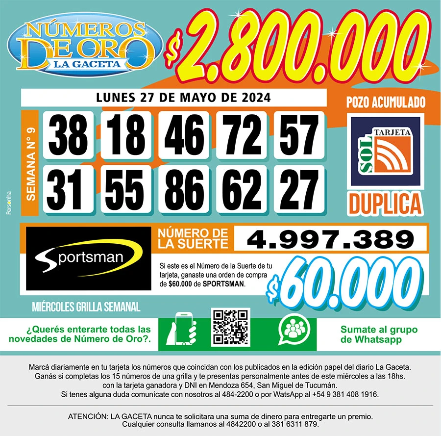Números de Oro Los Números de Oro de LA GACETA del 27 de mayo de 2024 Compartir Whatsapp Facebook X Copiar dirección URL 27 Mayo 2024 Seguir en Esta nota es de acceso libre. Temas WhatsApp Tamaño texto Comentarios Lo más popular UTA Tucumán confirma un paro de colectivos contra la reforma laboral en la previa a la cita en Diputados Proponen transformar El Bajo en una especie de mini Puerto Madero Importaciones de cubiertas chinas: Fate anunció su cierre definitivo y el despido de 920 trabajadores Ataque en Tafí del Valle: una espera que despierta sospechas La lista de nombres que Santiago Bagne aportó para profundizar la pesquisa Ataque en Tafí del Valle: la violencia arruinó el plan de vacaciones