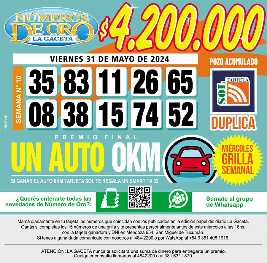 Números de Oro Los Números de Oro de LA GACETA del 31 de mayo de 2024 Compartir Whatsapp Facebook X Copiar dirección URL 31 Mayo 2024 Seguir en Esta nota es de acceso libre. Temas WhatsApp Tamaño texto Comentarios Lo más popular Proponen transformar El Bajo en una especie de mini Puerto Madero Ataque en Tafí del Valle: una espera que despierta sospechas UTA Tucumán confirma un paro de colectivos contra la reforma laboral en la previa a la cita en Diputados Importaciones de cubiertas chinas: Fate anunció su cierre definitivo y el despido de 920 trabajadores La lista de nombres que Santiago Bagne aportó para profundizar la pesquisa Ataque en Tafí del Valle: la violencia arruinó el plan de vacaciones