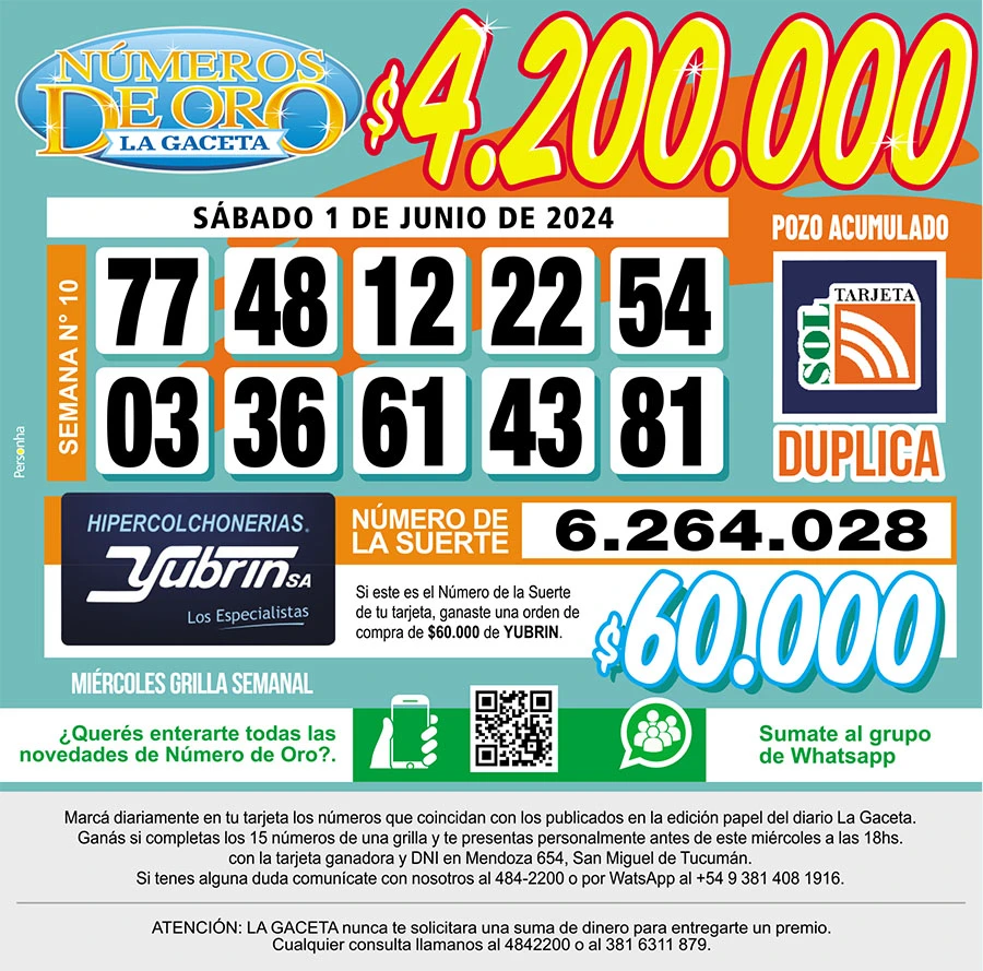 Números de Oro Los Números de Oro de LA GACETA del 1 de junio de 2024 Compartir Whatsapp Facebook X Copiar dirección URL 01 Junio 2024 Seguir en Esta nota es de acceso libre. Temas FacebookWhatsAppSistema Único de Boleto Electrónico Tamaño texto Comentarios Lo más popular Proponen transformar El Bajo en una especie de mini Puerto Madero Ataque en Tafí del Valle: una espera que despierta sospechas UTA Tucumán confirma un paro de colectivos contra la reforma laboral en la previa a la cita en Diputados Importaciones de cubiertas chinas: Fate anunció su cierre definitivo y el despido de 920 trabajadores La lista de nombres que Santiago Bagne aportó para profundizar la pesquisa Ataque en Tafí del Valle: la violencia arruinó el plan de vacaciones
