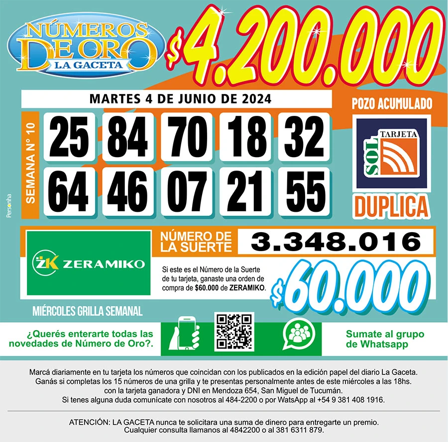 Números de Oro Los Números de Oro de LA GACETA del 4 de junio de 2024 Compartir Whatsapp Facebook X Copiar dirección URL 04 Junio 2024 Seguir en Esta nota es de acceso libre. Temas FacebookWhatsApp Tamaño texto Comentarios Lo más popular Proponen transformar El Bajo en una especie de mini Puerto Madero Ataque en Tafí del Valle: una espera que despierta sospechas UTA Tucumán confirma un paro de colectivos contra la reforma laboral en la previa a la cita en Diputados Importaciones de cubiertas chinas: Fate anunció su cierre definitivo y el despido de 920 trabajadores La lista de nombres que Santiago Bagne aportó para profundizar la pesquisa Ataque en Tafí del Valle: la violencia arruinó el plan de vacaciones