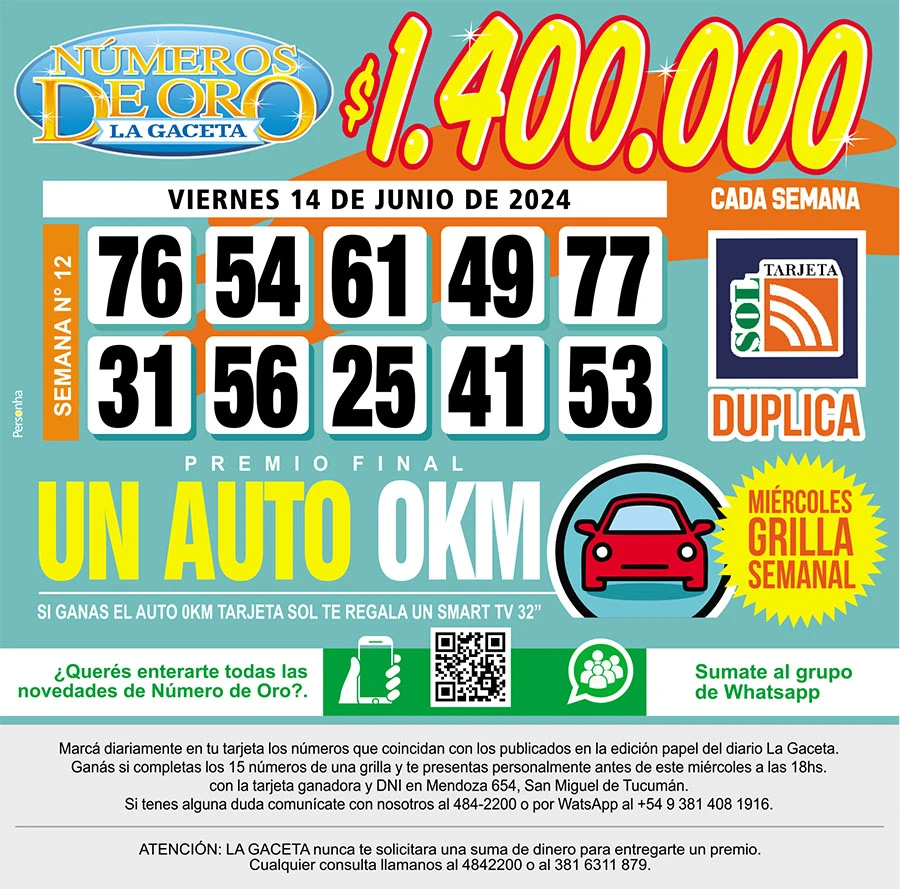 Números de Oro Los Números de Oro de LA GACETA del 14 de junio de 2024 Compartir Whatsapp Facebook X Copiar dirección URL 14 Junio 2024 Seguir en Esta nota es de acceso libre. Tamaño texto Comentarios Lo más popular Milei desligó a Sturzenegger del contrato millonario con una empresa que dirige su esposa A 20 años del crimen de Paulina Lebbos, César Soto enfrenta el juicio por homicidio El rincón secreto de Robert Duvall en el Norte Argentino: así es la estancia que compartió con su esposa salteña y hoy es un hotel de lujo La UTA confirmó un paro de colectivos en Tucumán: “No estamos de acuerdo con la reforma laboral” Carnaval con música en vivo en Tucumán: El Cadillal disfrutó a pesar de la lluvia Quién es Luciana Pedraza, la salteña que conquistó a Robert Duvall y fue su gran amor