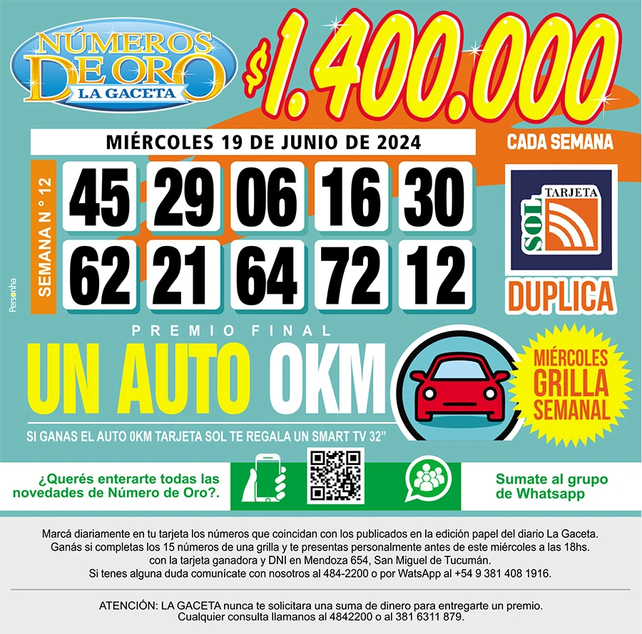 Números de Oro Los Números de Oro de LA GACETA del 19 de junio de 2024 Compartir Whatsapp Facebook X Copiar dirección URL 19 Junio 2024 Seguir en Esta nota es de acceso libre. Temas WhatsApp Tamaño texto Comentarios Lo más popular Milei desligó a Sturzenegger del contrato millonario con una empresa que dirige su esposa A 20 años del crimen de Paulina Lebbos, César Soto enfrenta el juicio por homicidio El rincón secreto de Robert Duvall en el Norte Argentino: así es la estancia que compartió con su esposa salteña y hoy es un hotel de lujo La UTA confirmó un paro de colectivos en Tucumán: “No estamos de acuerdo con la reforma laboral” Carnaval con música en vivo en Tucumán: El Cadillal disfrutó a pesar de la lluvia Quién es Luciana Pedraza, la salteña que conquistó a Robert Duvall y fue su gran amor