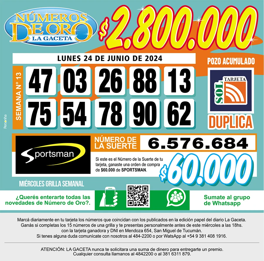 Números de Oro Los Números de Oro de LA GACETA del 24 de junio de 2024 Compartir Whatsapp Facebook X Copiar dirección URL 24 Junio 2024 Seguir en Esta nota es de acceso libre. Temas WhatsApp Tamaño texto Comentarios Lo más popular Milei desligó a Sturzenegger del contrato millonario con una empresa que dirige su esposa A 20 años del crimen de Paulina Lebbos, César Soto enfrenta el juicio por homicidio El rincón secreto de Robert Duvall en el Norte Argentino: así es la estancia que compartió con su esposa salteña y hoy es un hotel de lujo La UTA confirmó un paro de colectivos en Tucumán: “No estamos de acuerdo con la reforma laboral” Carnaval con música en vivo en Tucumán: El Cadillal disfrutó a pesar de la lluvia Quién es Luciana Pedraza, la salteña que conquistó a Robert Duvall y fue su gran amor