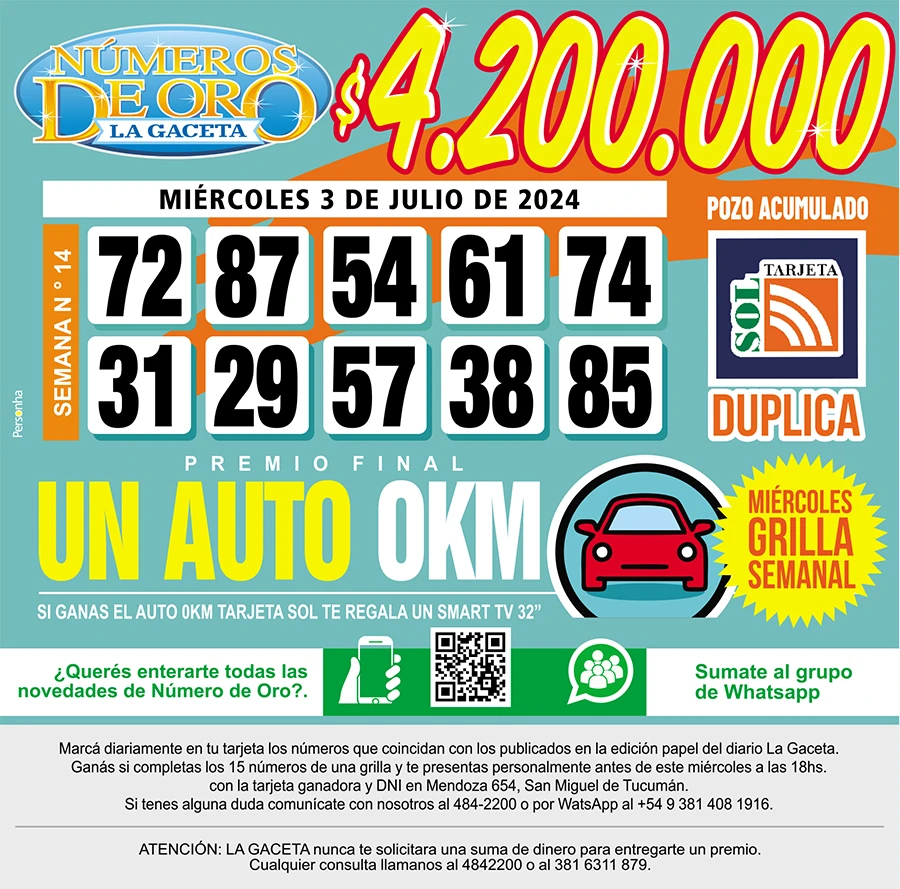 Los Números de Oro de LA GACETA del 3 de julio de 2024