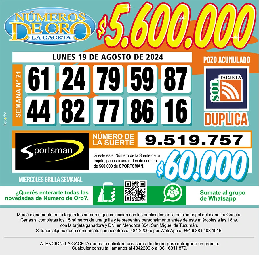 Los Números de Oro de LA GACETA del 19 de agosto de 2024