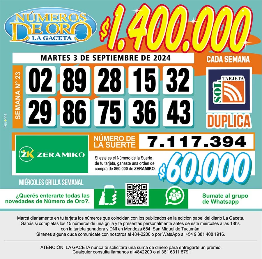 Los Números de Oro de LA GACETA del 3 de septiembre de 2024