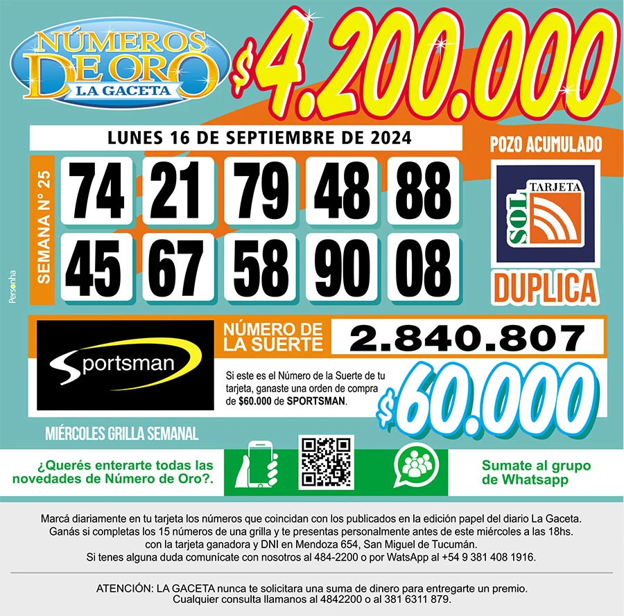 Los Números de Oro de LA GACETA del 16 de septiembre de 2024