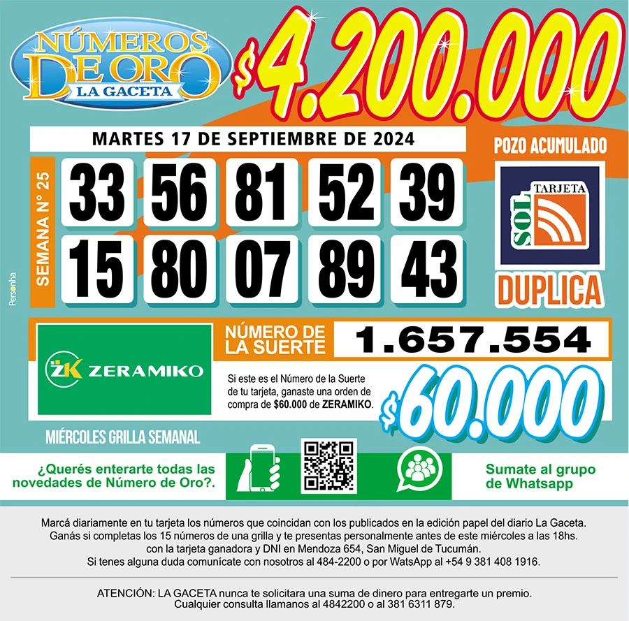 Los Números de Oro de LA GACETA del 17 de septiembre de 2024