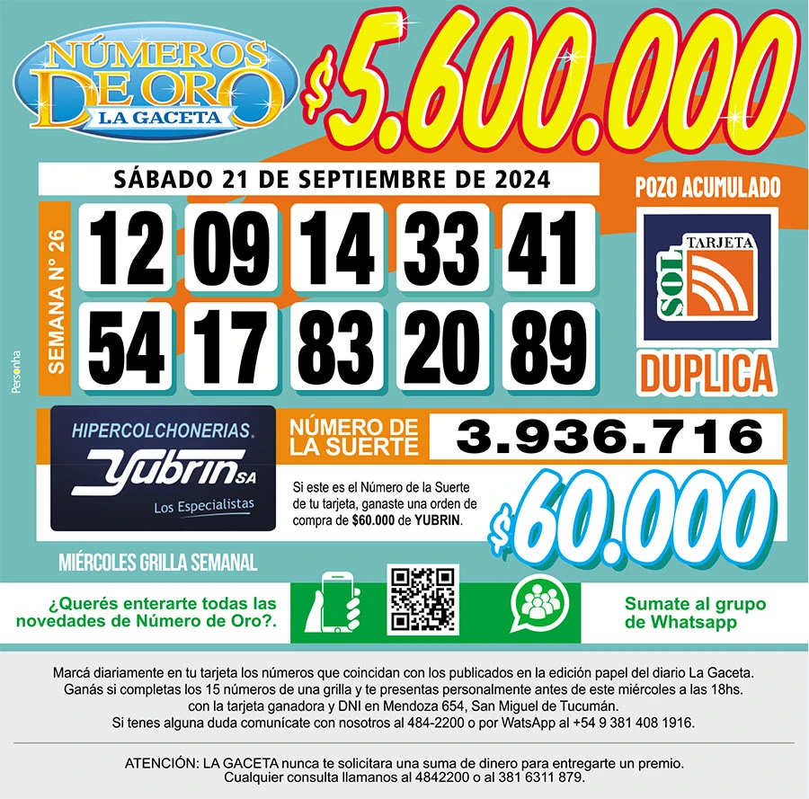 Los Números de Oro de LA GACETA del 21 de septiembre de 2024