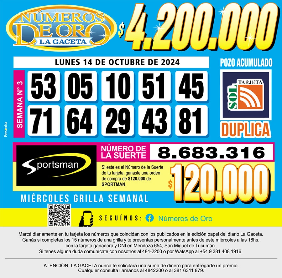 Los Números de Oro de LA GACETA del 14 de octubre de 2024