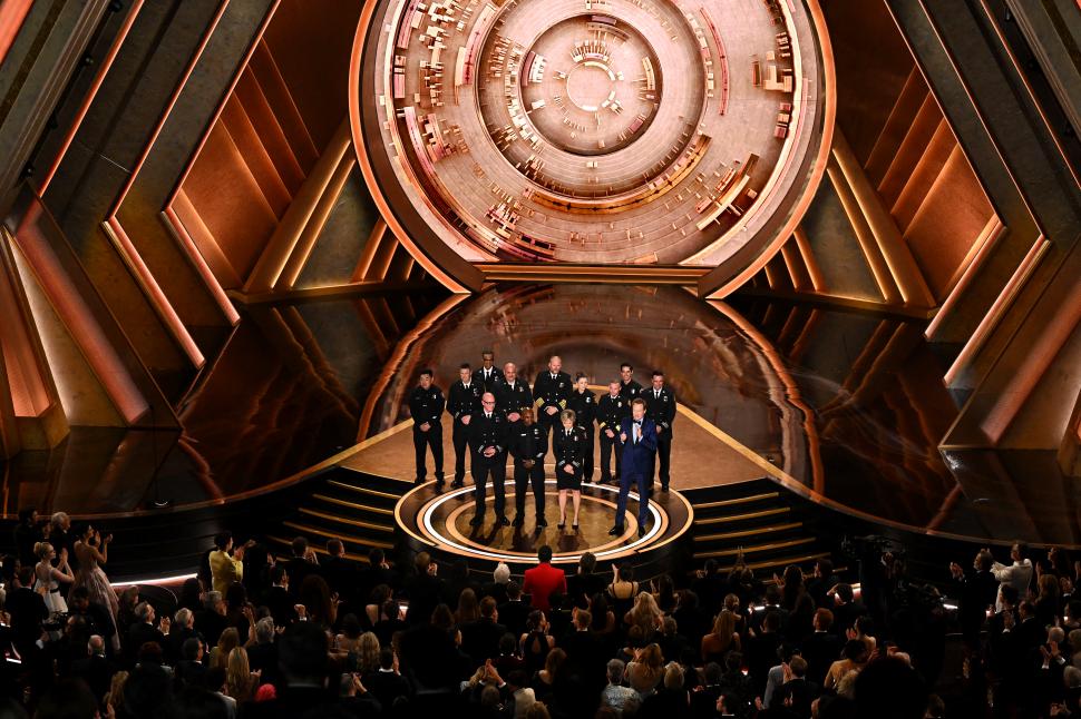 DE PIE. La platea de artistas en pleno le brindó una firme ovación a los bomberos que lucharon contra los incendios de Los Ángeles de enero.