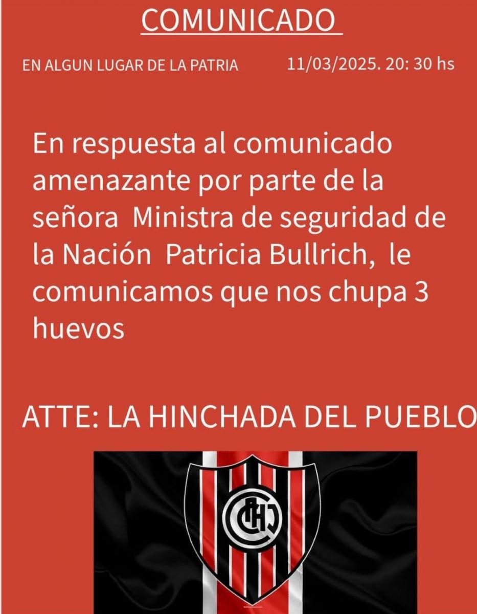 En un mensaje viralizado por WhatsApp y redes sociales, los hinchas del club de San Martín expresaron su rechazo al comunicado del Gobierno. "En respuesta al comunicado amenazante, le comunicamos que nos chupa 3 huevos. ATTE: LA HINCHADA DEL PUEBLO", fue la respuesta dirigida a la ministra de Seguridad, quien había señalado que se implementarían medidas severas para garantizar el orden durante la movilización. Este mensaje se compartió en las redes sociales la noche del martes, sumando rápidamente apoyo y visibilidad.