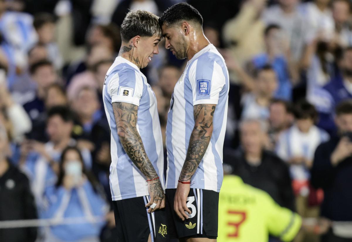 FESTEJO. Enzo Fernández y "Cuti" Romero celebran la goleada histórica de la Selección Argentina. Foto tomada de X.