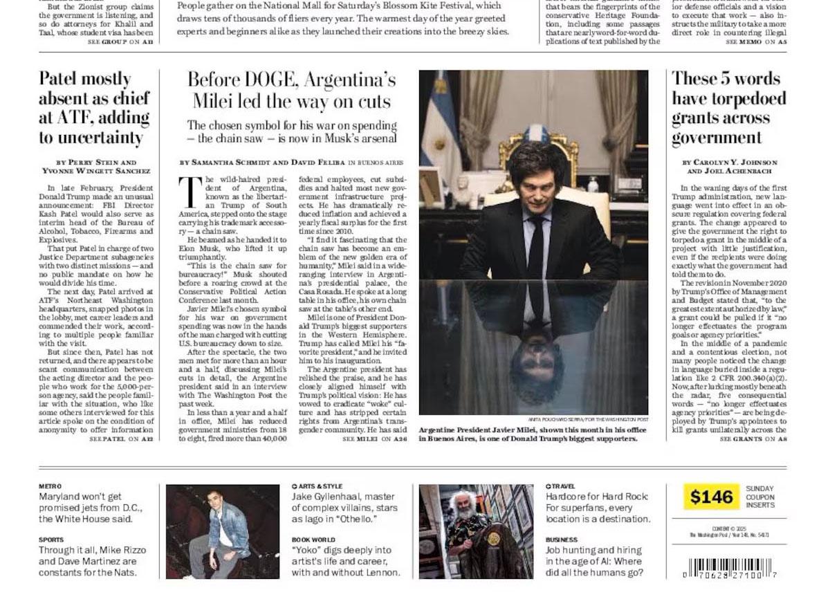 Javier Milei apareció en la portada del The Washington Post, en su edición impresa del último domingo. La aparición del mandatario argentino se dio en el marco de una nota que destacó los recortes que el líder libertario llevó adelante en el país desde su asunción al frente de la Poder Ejecutivo Nacional, y cómo eso puede tomarse como un antecedente del Departamento de Eficiencia Gubernamental (DOGE) que encabeza el empresario Elon Musk y que se encarga de implementar el plan de desregulaciones que Donald Trump impulsa desde su regreso a la Casa Blanca.