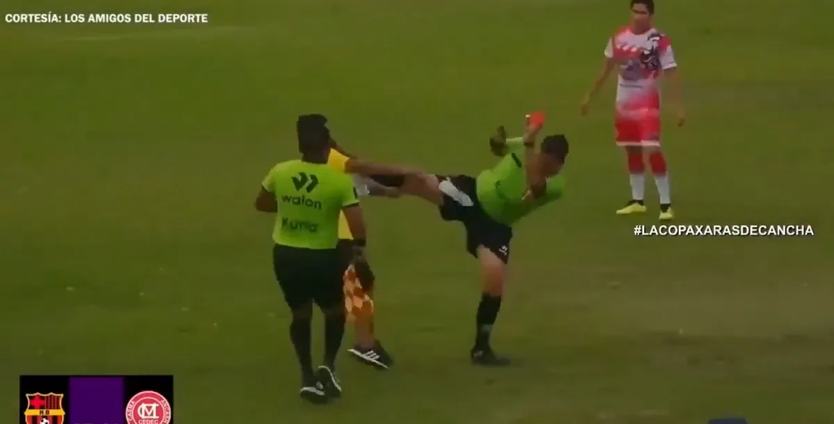 El partido transcurría sin sobresaltos hasta que, a ocho minutos del final, el árbitro decidió expulsar a un jugador. La decisión encendió los ánimos y provocó la reacción del cuerpo técnico visitante. Fue entonces cuando un integrante del staff ingresó al terreno de juego con una botella en la mano, aparentemente dispuesto a agredir al árbitro. Alegre, sin dudarlo, reaccionó con una contundente patada en el pecho, derribando al atacante en el acto.
