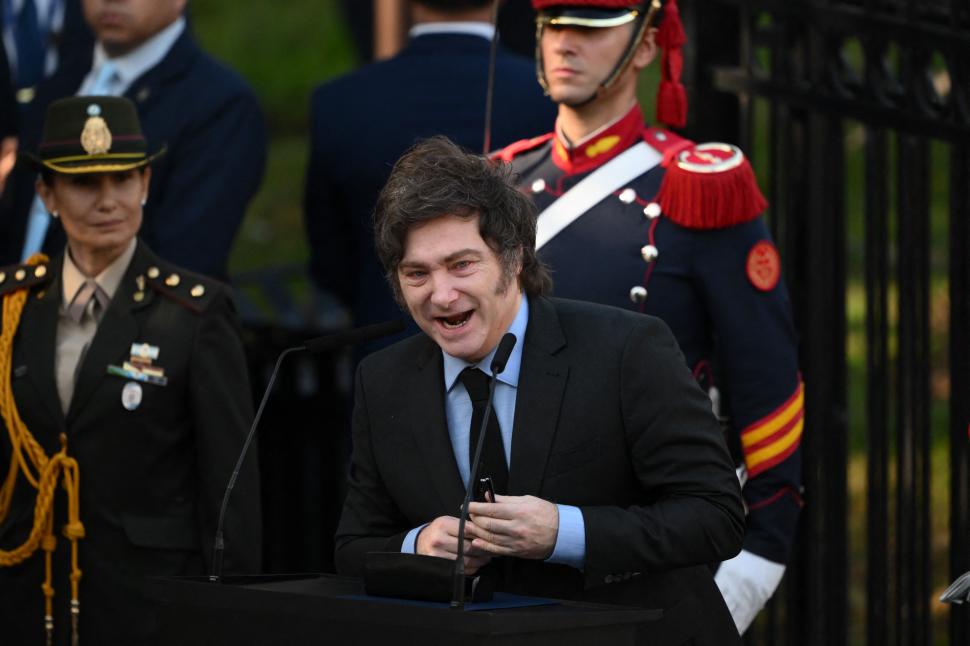 Minutos después de las 9, Milei se detuvo unos instantes ante la placa del soldado desconocido -acompañado por Jorge Macri, Patricia Bullrich, Luis Petri y Martín Menem- e instantes después colocó una ofrenda floral al pie del monumento dedicado a los héroes de Malvinas.