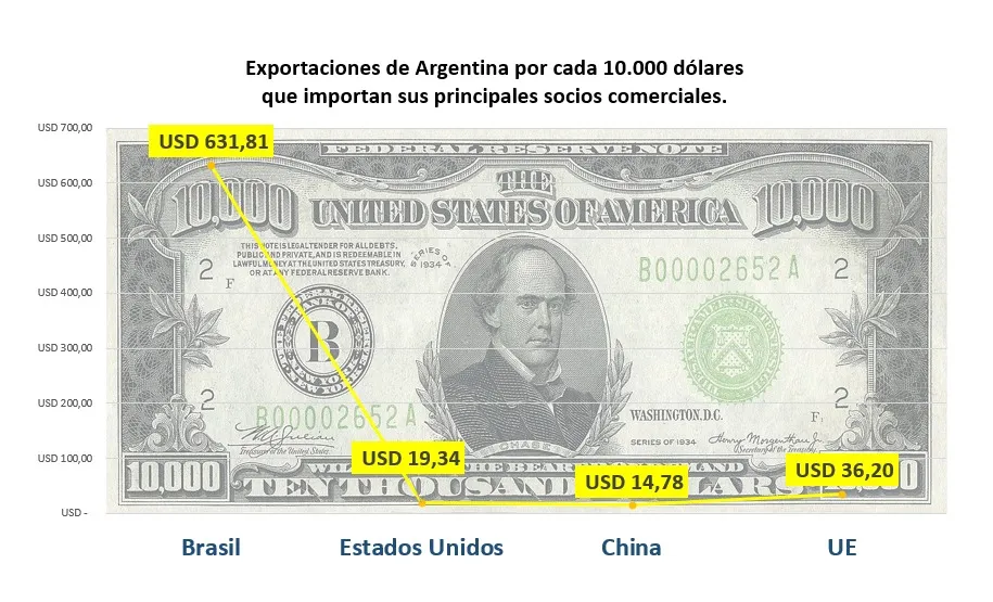 Brasil como principal socio comercial de Argentina en diciembre de 2024, por cada U$S 10.000 que el país vecino importó, U$S 631,81 dólares provinieron de Argentina. Si bien esto representa solo el 6,31% del total de las importaciones brasileñas, en términos absolutos significa un volumen considerable de comercio, alcanzando los U$S 1.270 millones en exportaciones argentinas hacia Brasil.